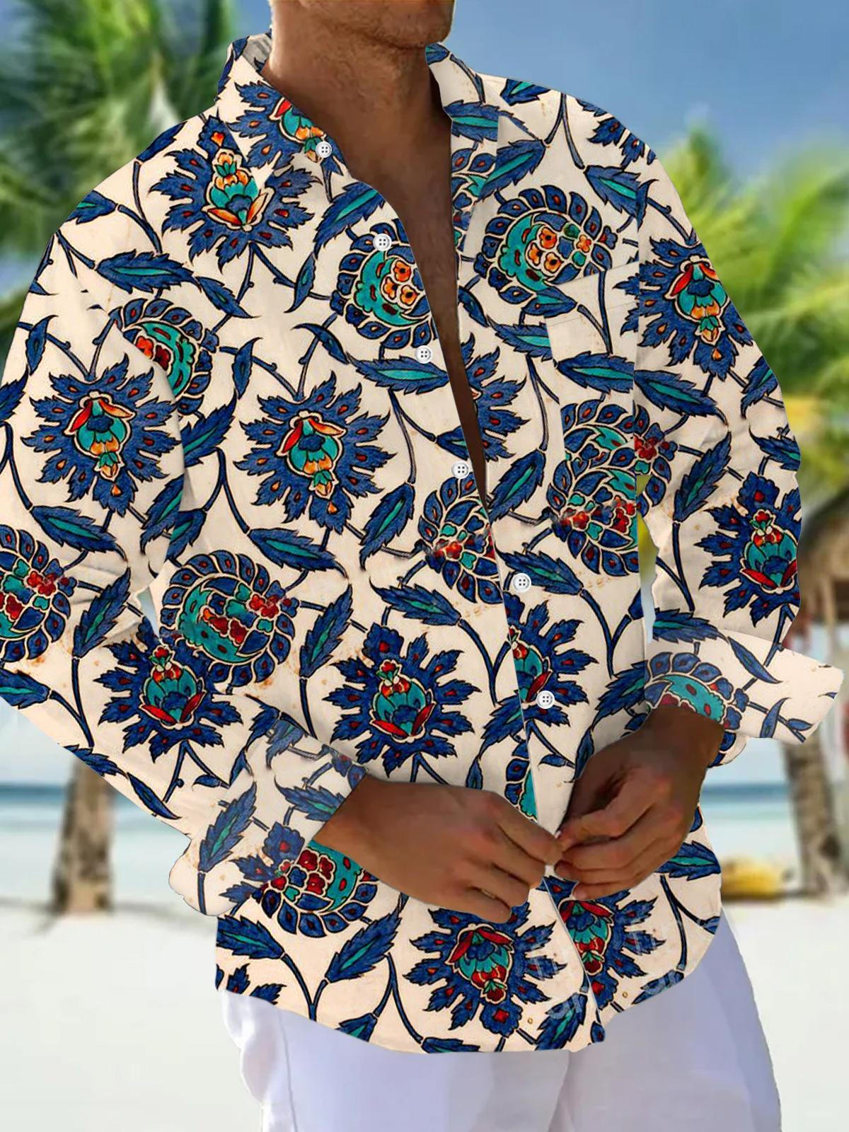 Langärmlige Herrenhemden mit ethnischem Blumendruck und Tasche