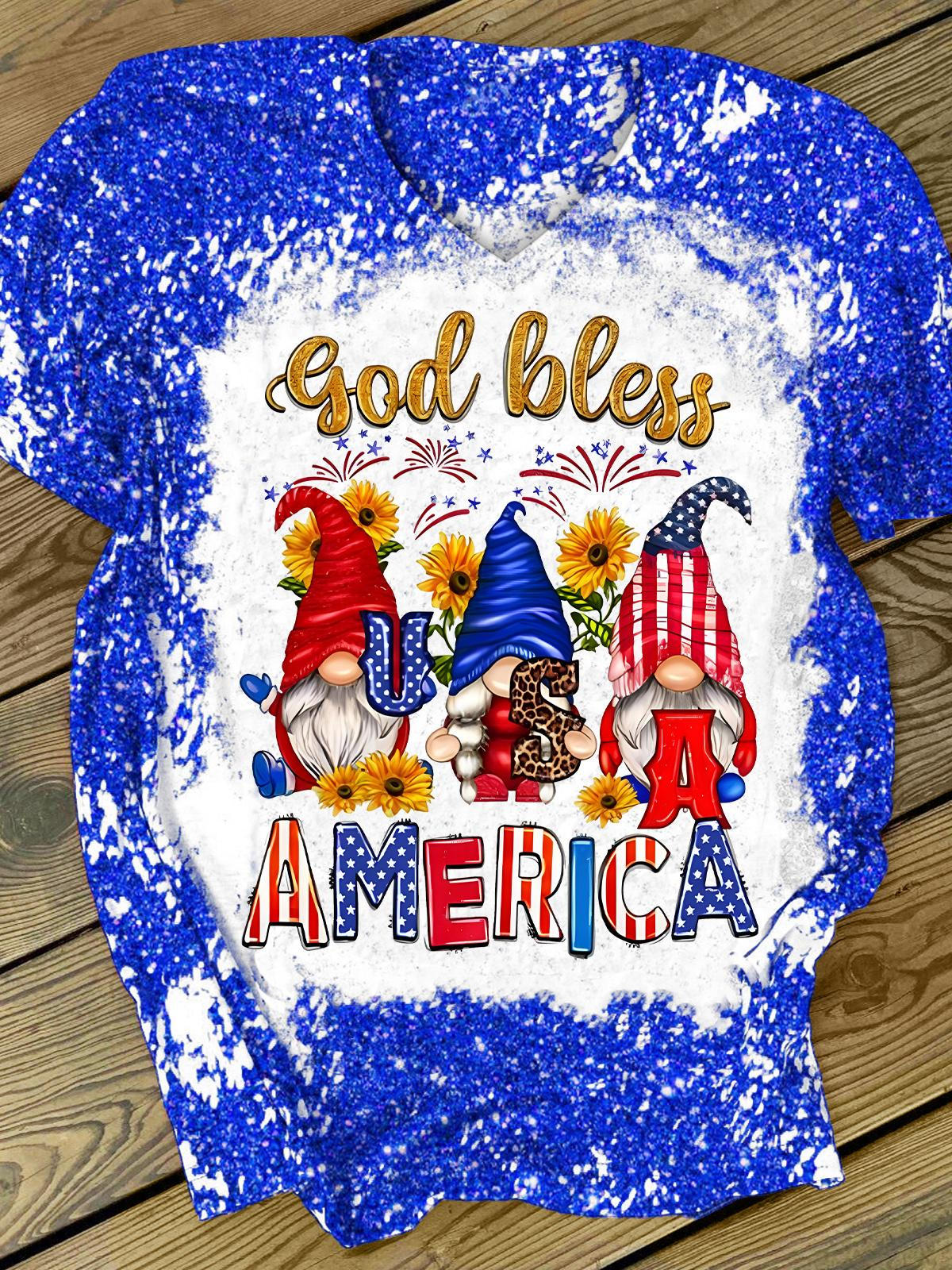 God Bless America Gnome Glitter Print V-Neck Short Sleeve T-Shirt