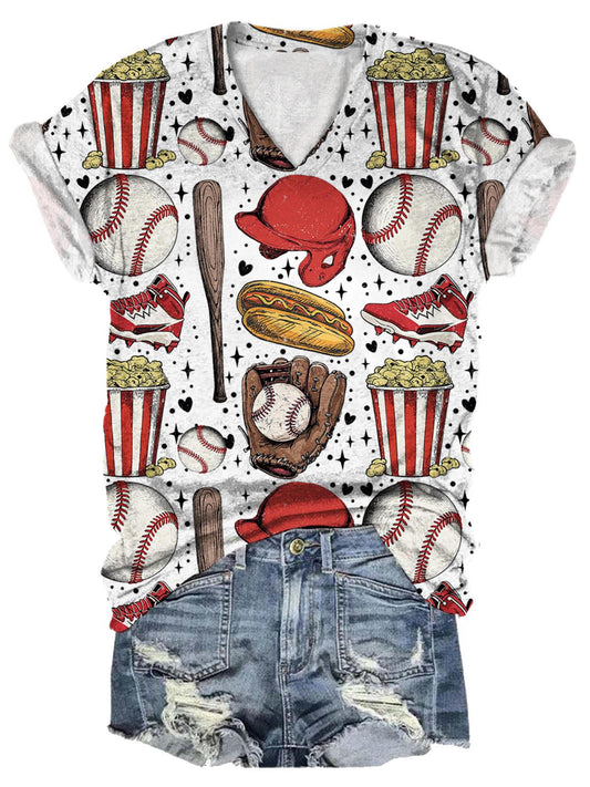 Baseball & Snacks Print V-Neck T-...