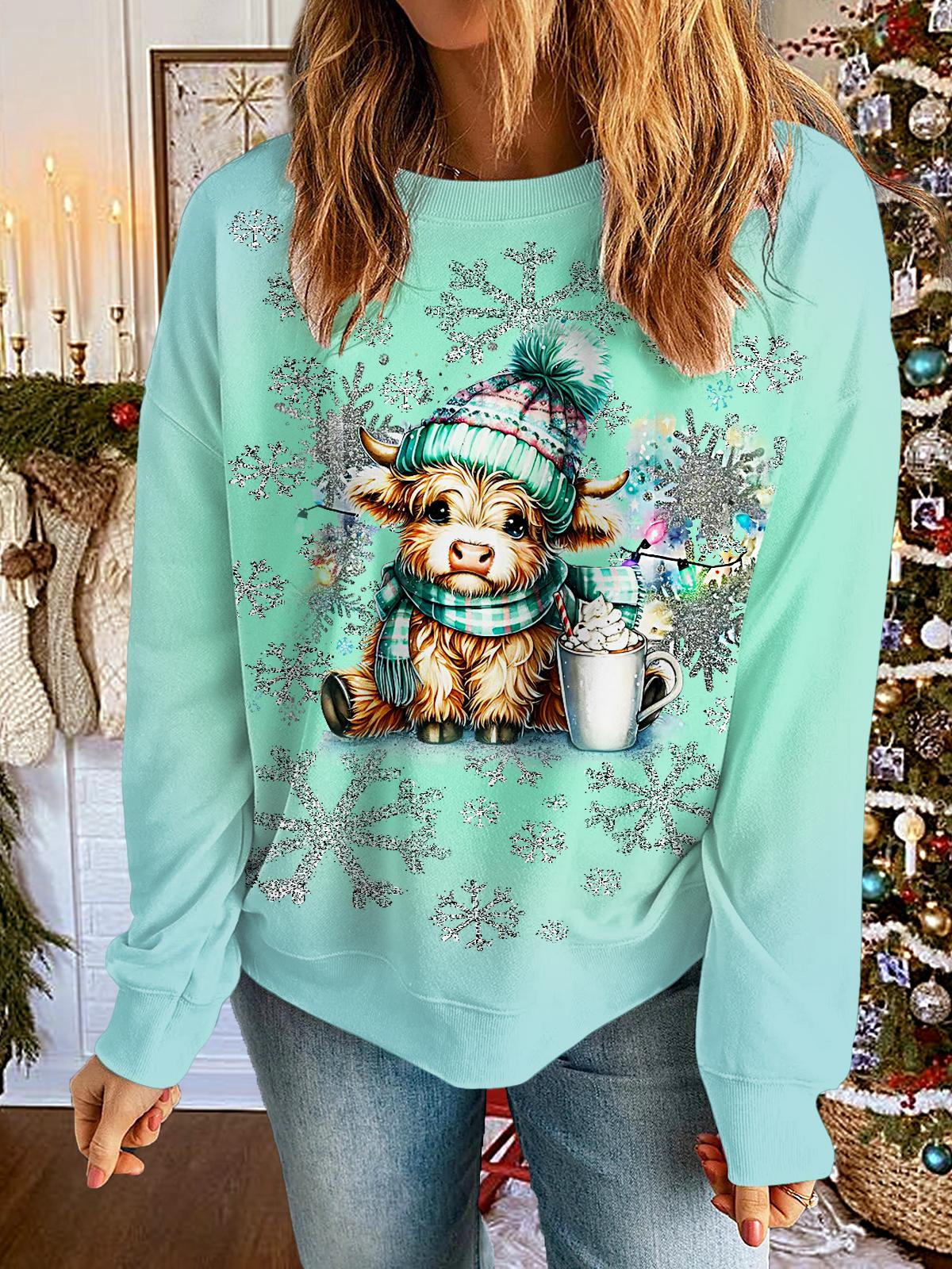 Damen Weihnachts-Langarm-Freizeitoberteil mit blauem und grünem Highland-Kuh-Aufdruck