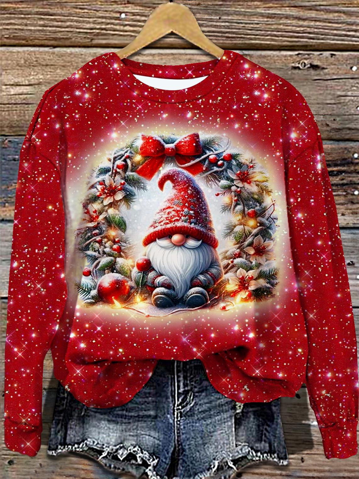 Damen-Oberteil mit Rundhalsausschnitt und langen Ärmeln und süßem Weihnachtswichtel-Aufdruck