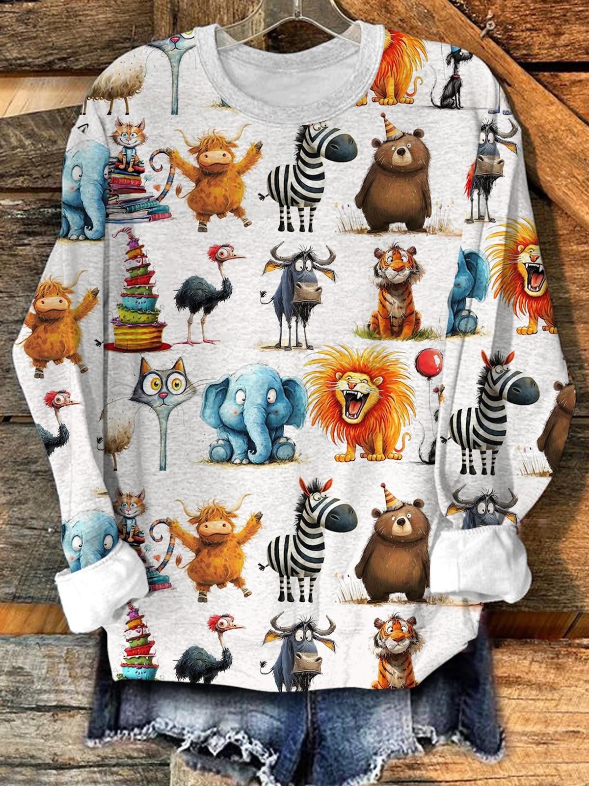 Cute Animal Print Casual Round Neck Long Sleeve Top