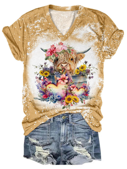 Heart Floral Highland Cow V-Neck Tie ...