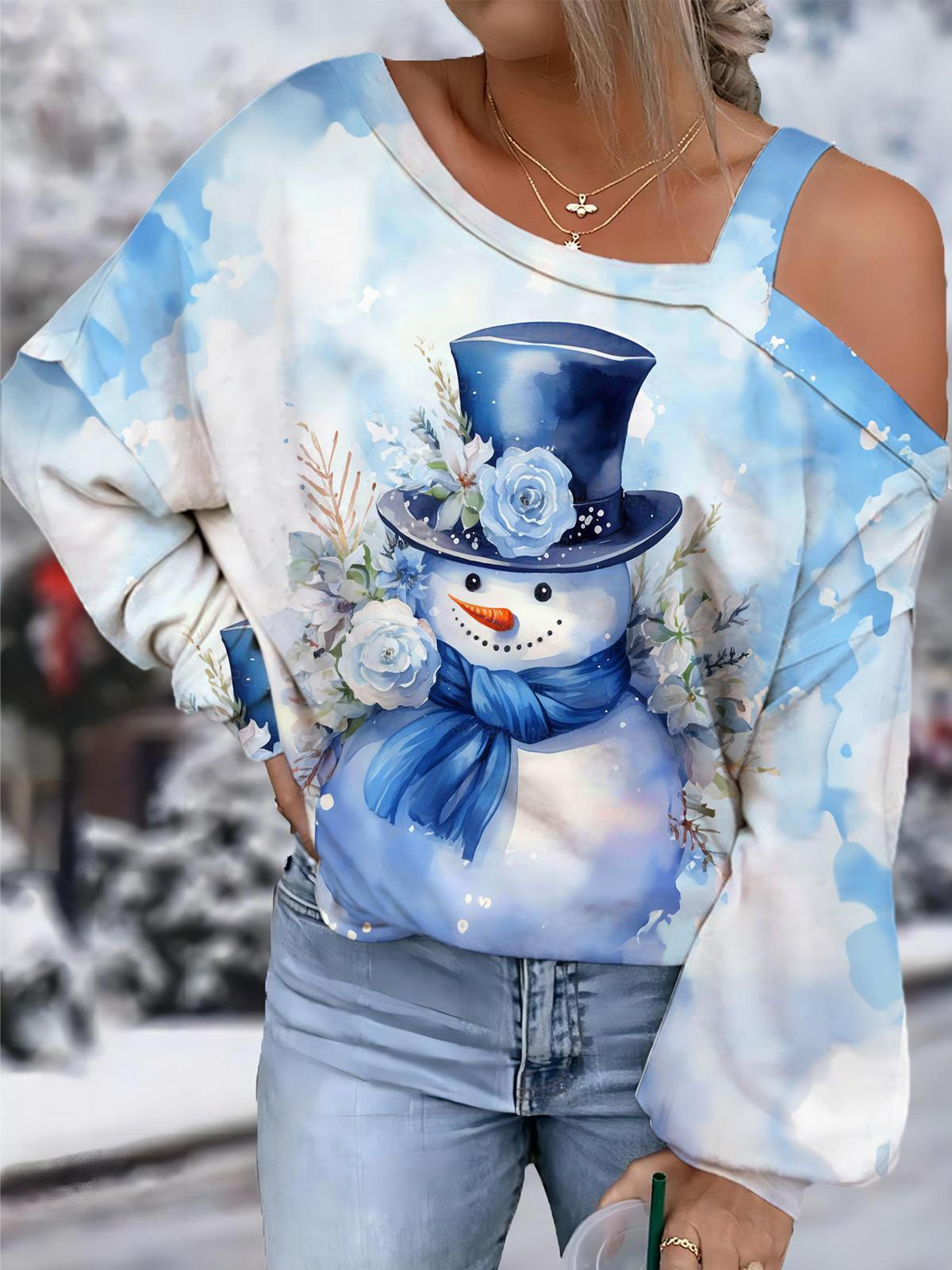 Blue Flower Snowman One Shoulder Long Sleeve Tops