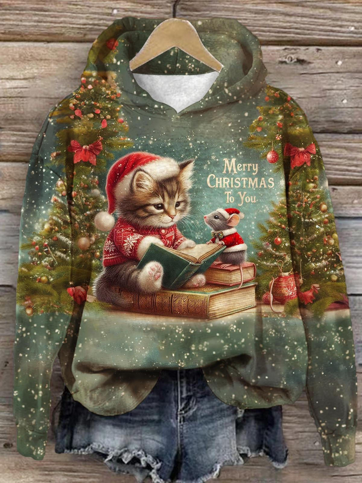 Christmas Cute Cat and Opossum Print Long Sleeve Top