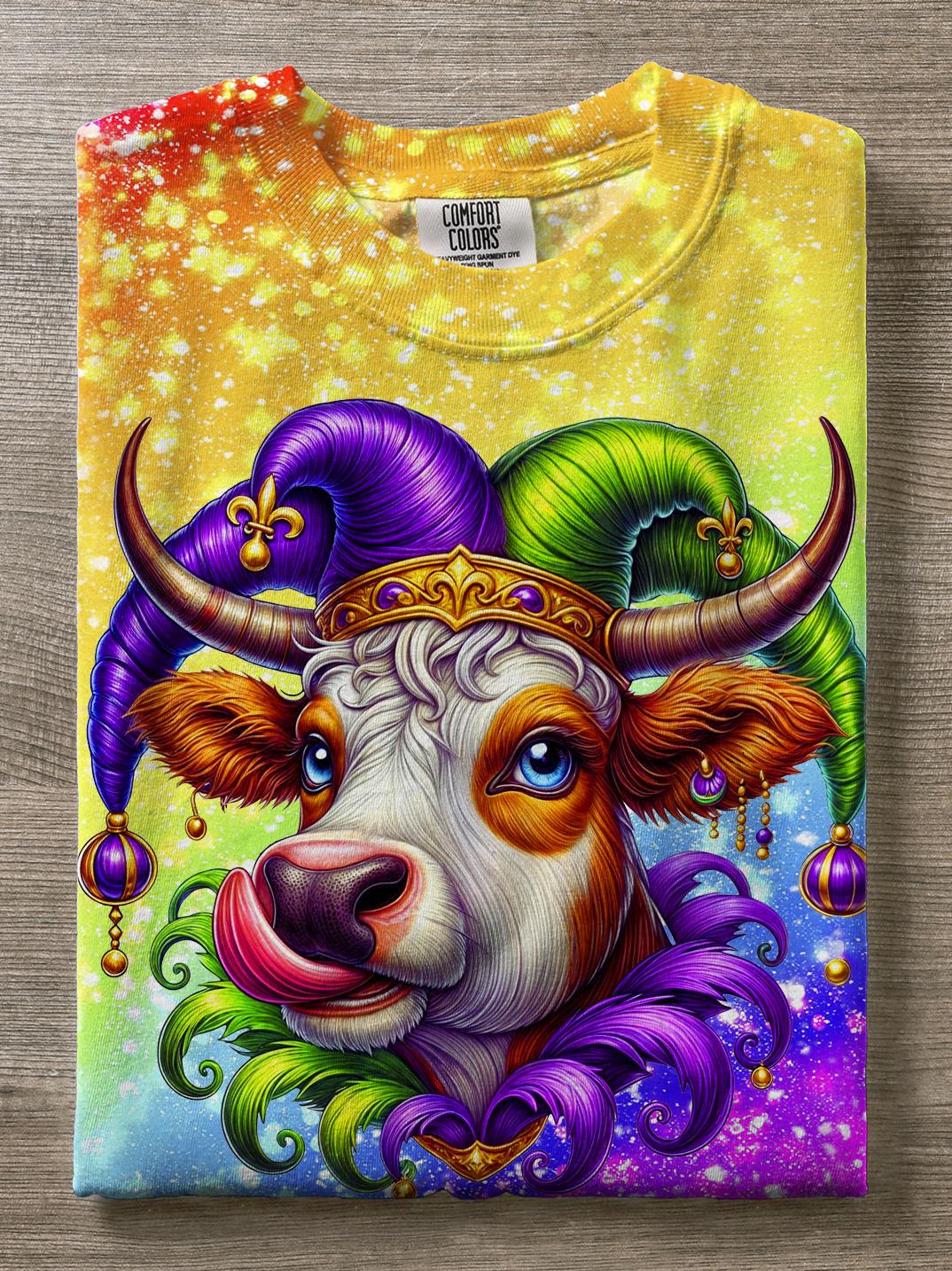 Mardi Gras Cow Character Party Rainbow Starlight Print Casual T-shirt