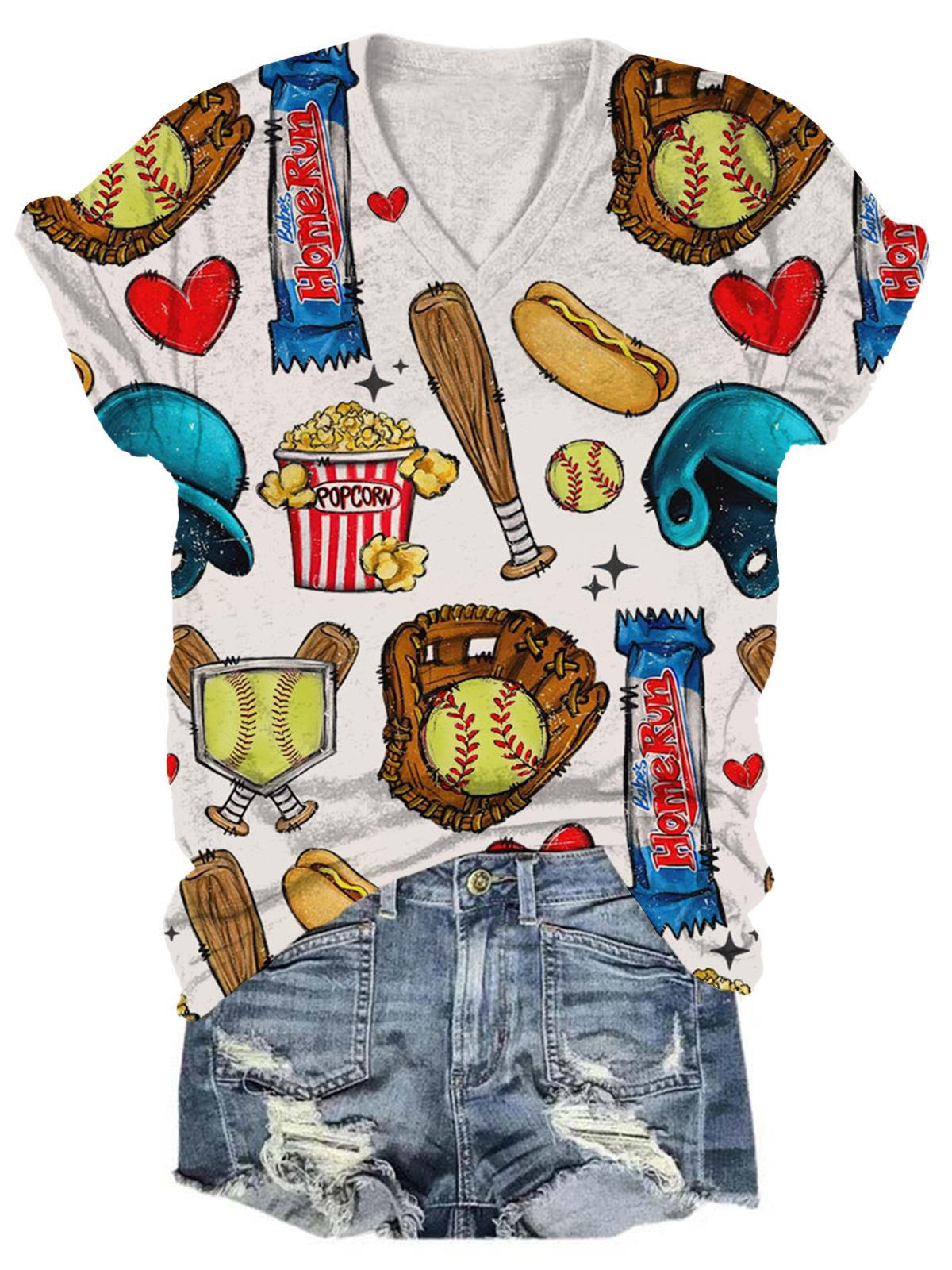 Retro Softball & Snacks Print V-Neck T-Shirt