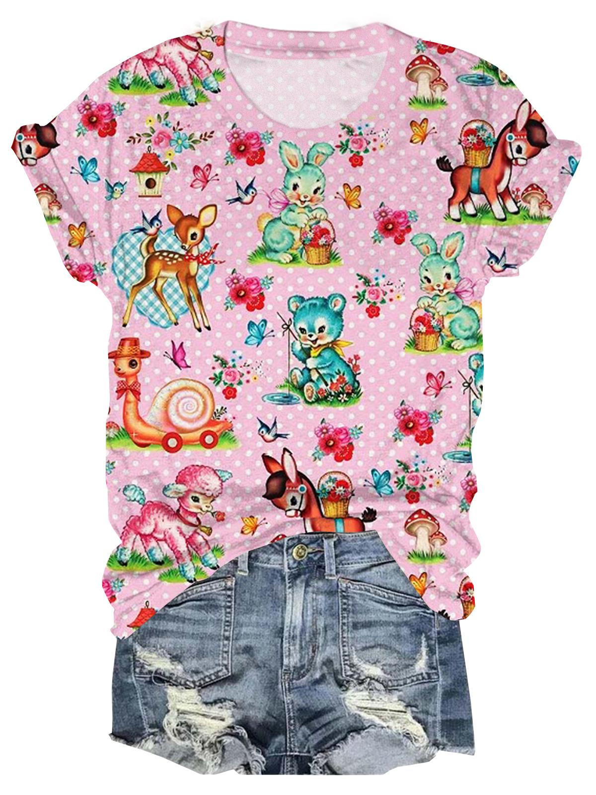 Vintage Animals Polka Dots Crew Neck T-shirt