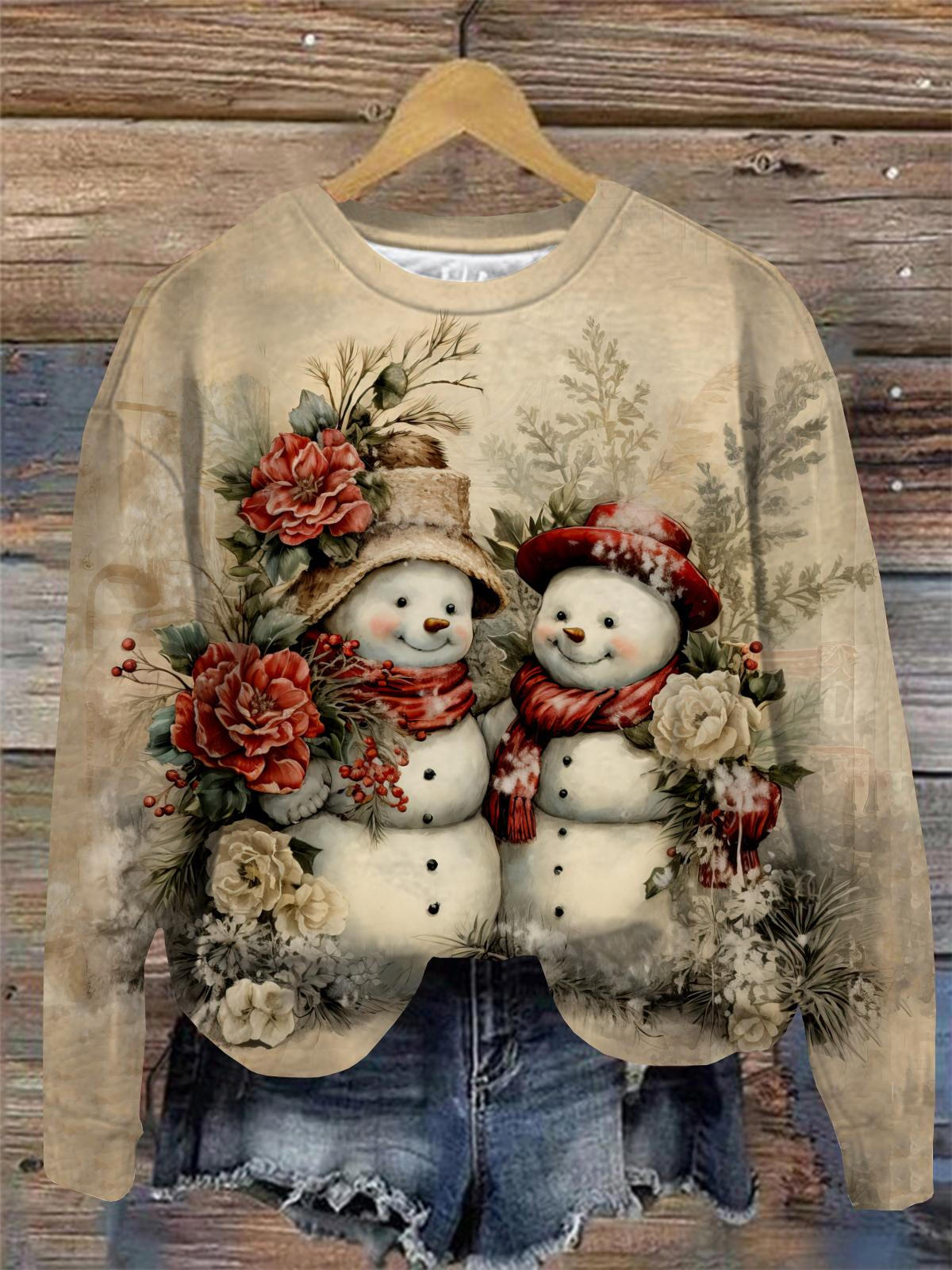 Vintage Snowmen in Winter Scenery Round Neck Long Sleeve Top