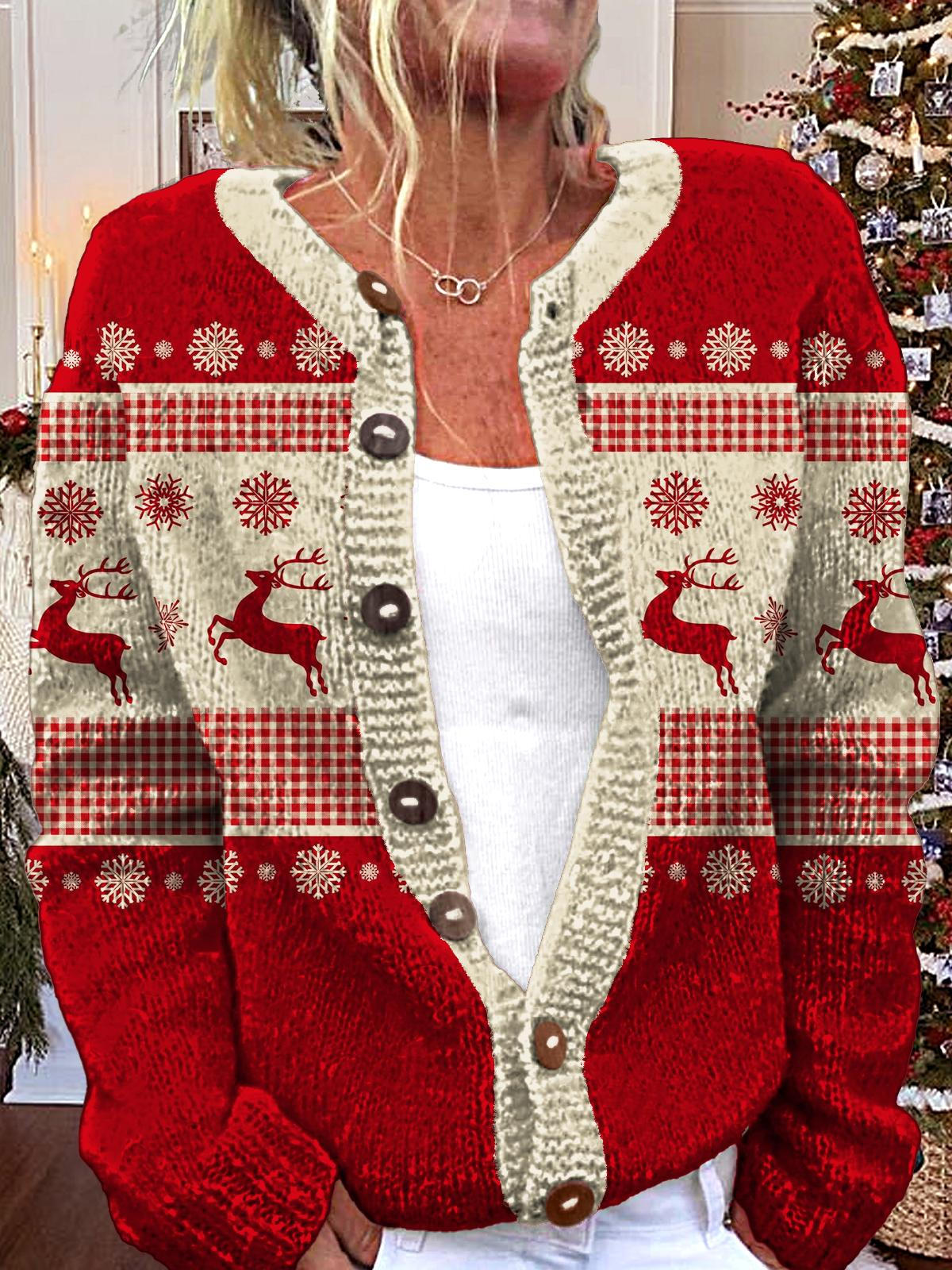 Women's Christmas Reindeer Round Neck Long Sleeve Cardigan
