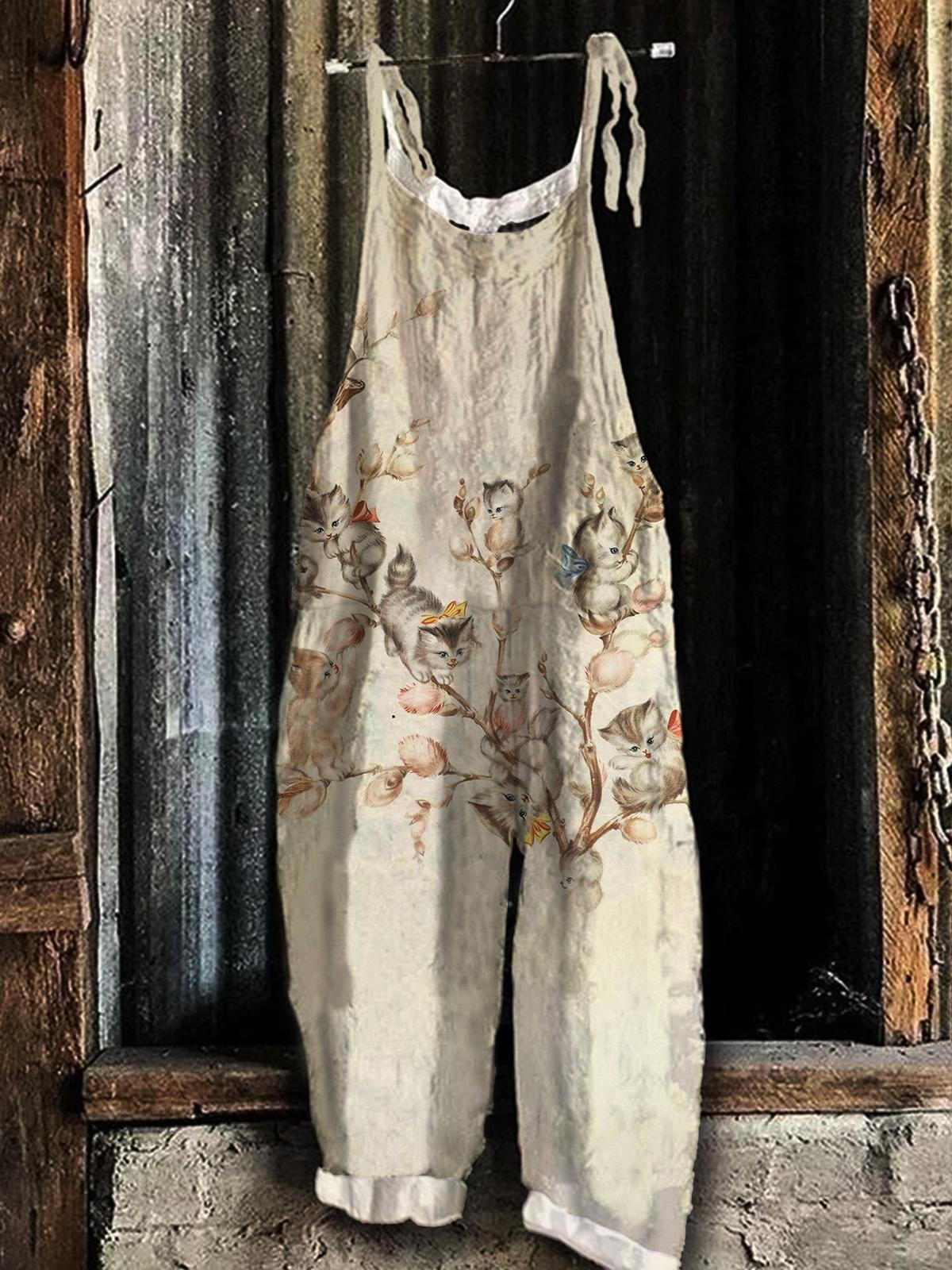 Women's Cute Cat Animal Tree Retro Print Casual Jumpsuit