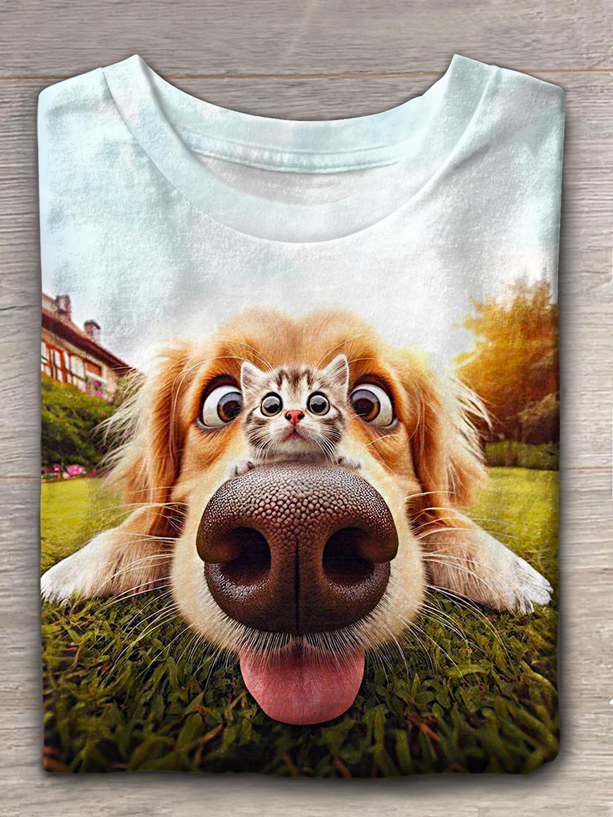 Women's Cute Puppy And Kitten Print Crew Neck T-shirt
