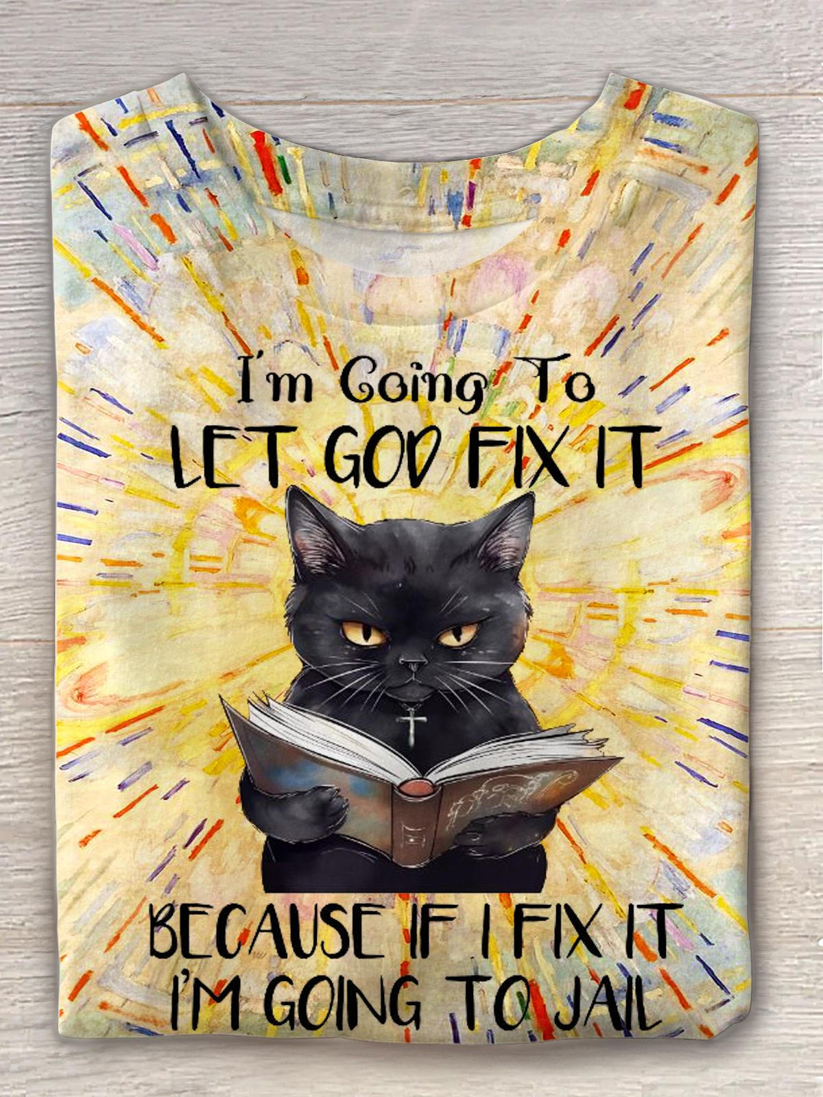 Women's Funny Cat Christian Print Crew Neck T-shirt