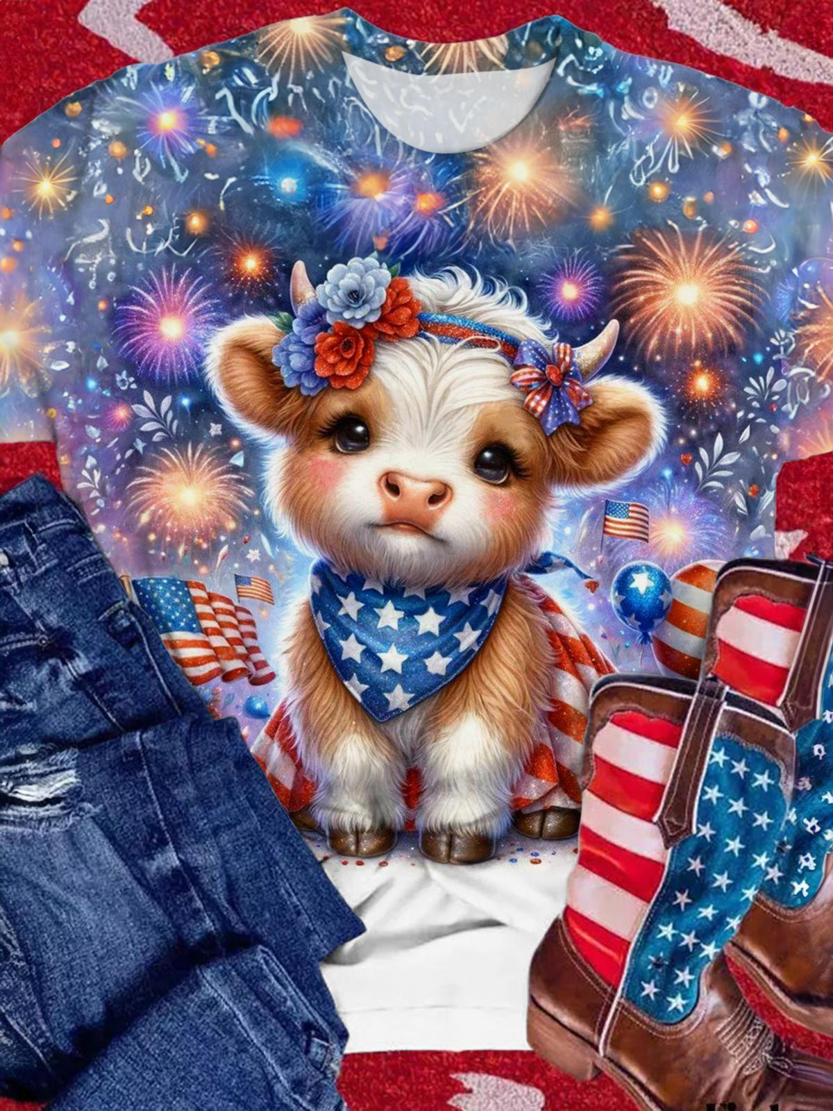 Firework Highland Cow Crew Neck T-shirt